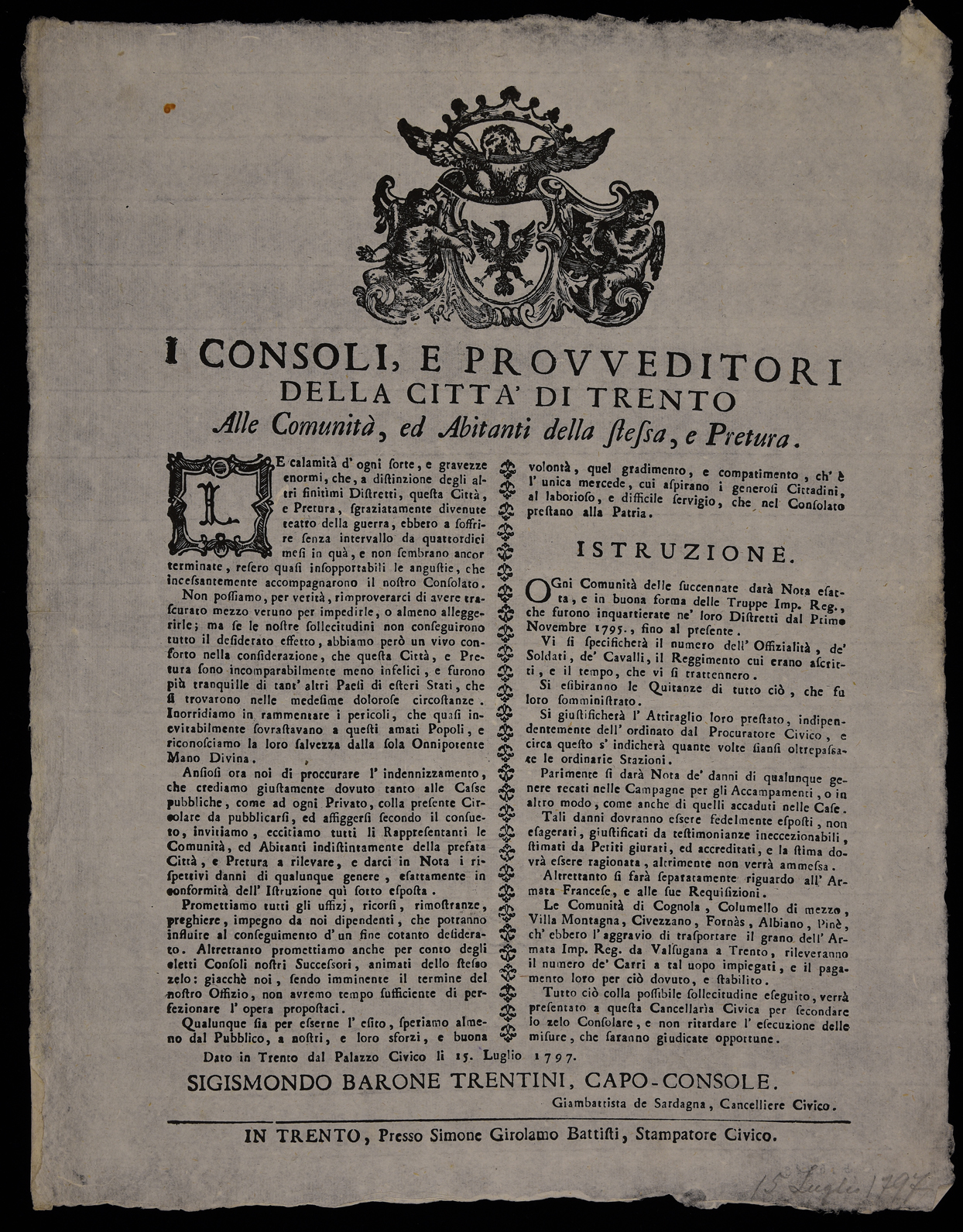 1 manifesto. Proclama sui pagamenti dei danni di guerra emanato il 15 luglio 1797 dal Magistrato consolare di Trento, stemma del Magistrato consolare di Trento