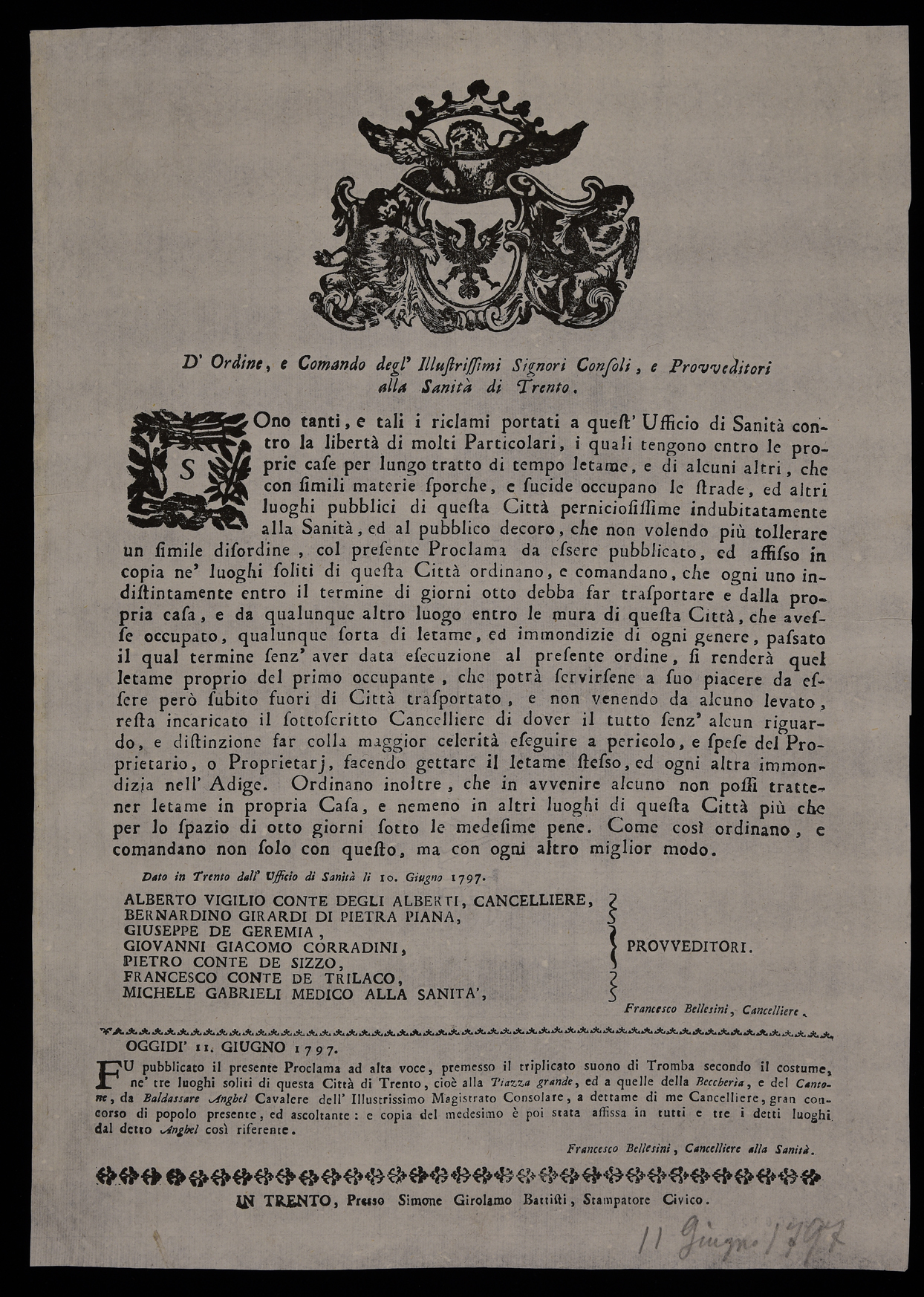 1 manifesto. Proclama sullo smaltimento del letame e delle immondizie emanato il 10 giugno 1797 dall'Ufficio della sanità di Trento, stemma del Magistrato consolare di Trento