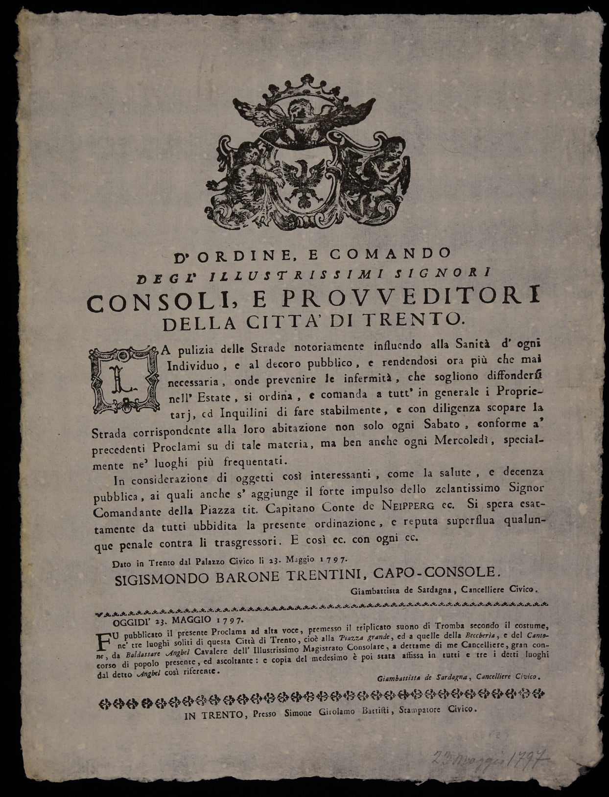 1 manifesto. Proclama sulla pulizia delle strade pubbliche emanato il 23 maggio 1797 dal Magistrato consolare di Trento, stemma del Magistrato consolare di Trento