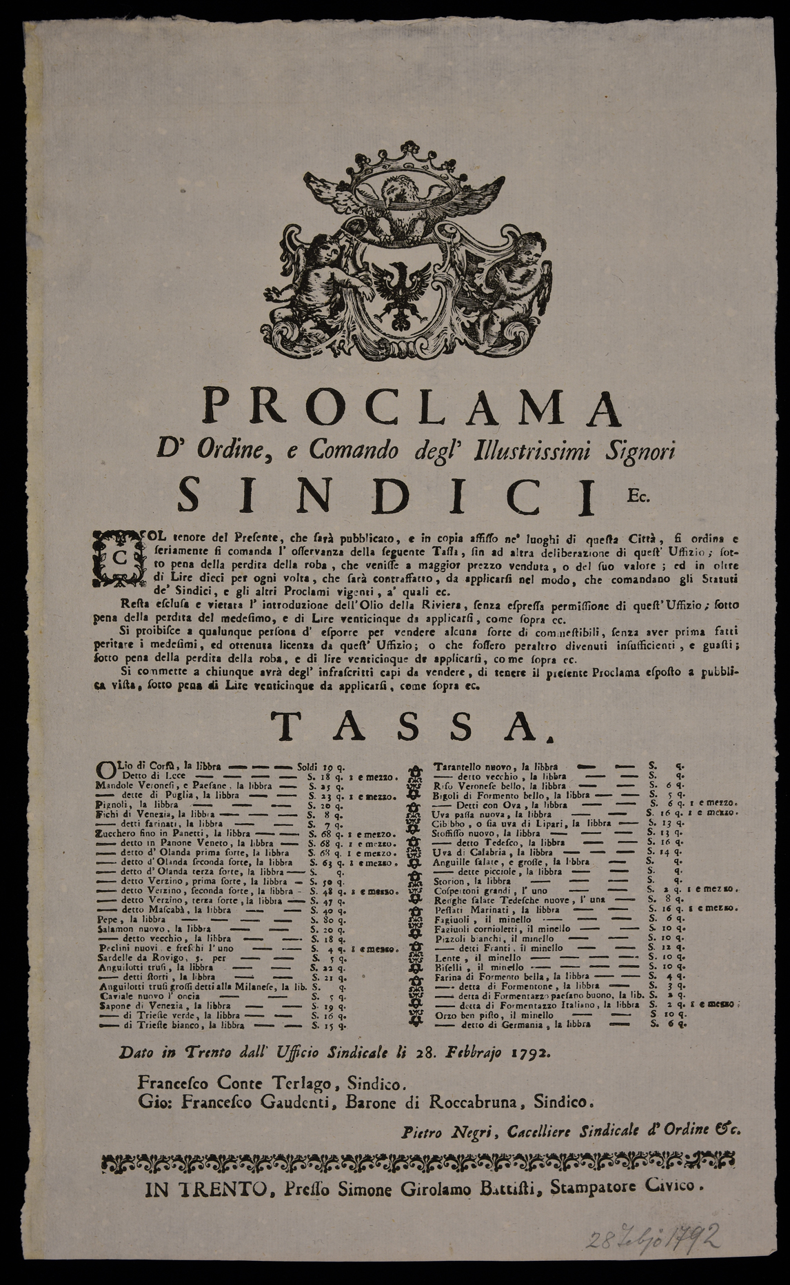 1 manifesto. Proclama sul prezzo dei generi alimentari emanato il 28 febbraio 1792 dal Magistrato consolare di Trento, stemma del Magistrato consolare di Trento