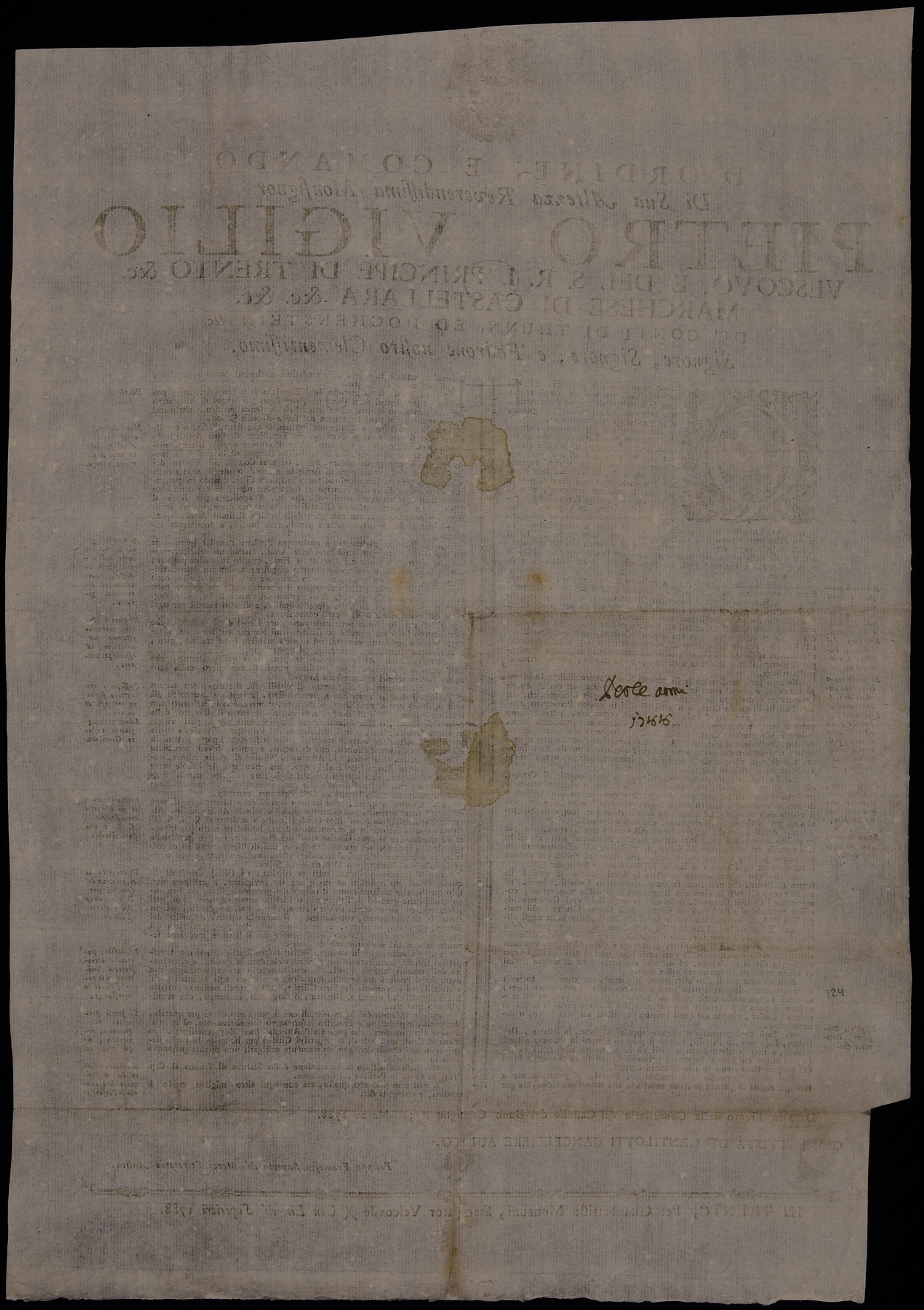 | D'ordine, e comando di sua altezza reverendissima monsignor Pietro Vigilio vescovo, e del S.R.I. principe di Trento &c. marchese di Castellara &c. &c. de' conti di Thunn, ed Hochenstein &c. signore, signore, e padrone nostro clementissimo |