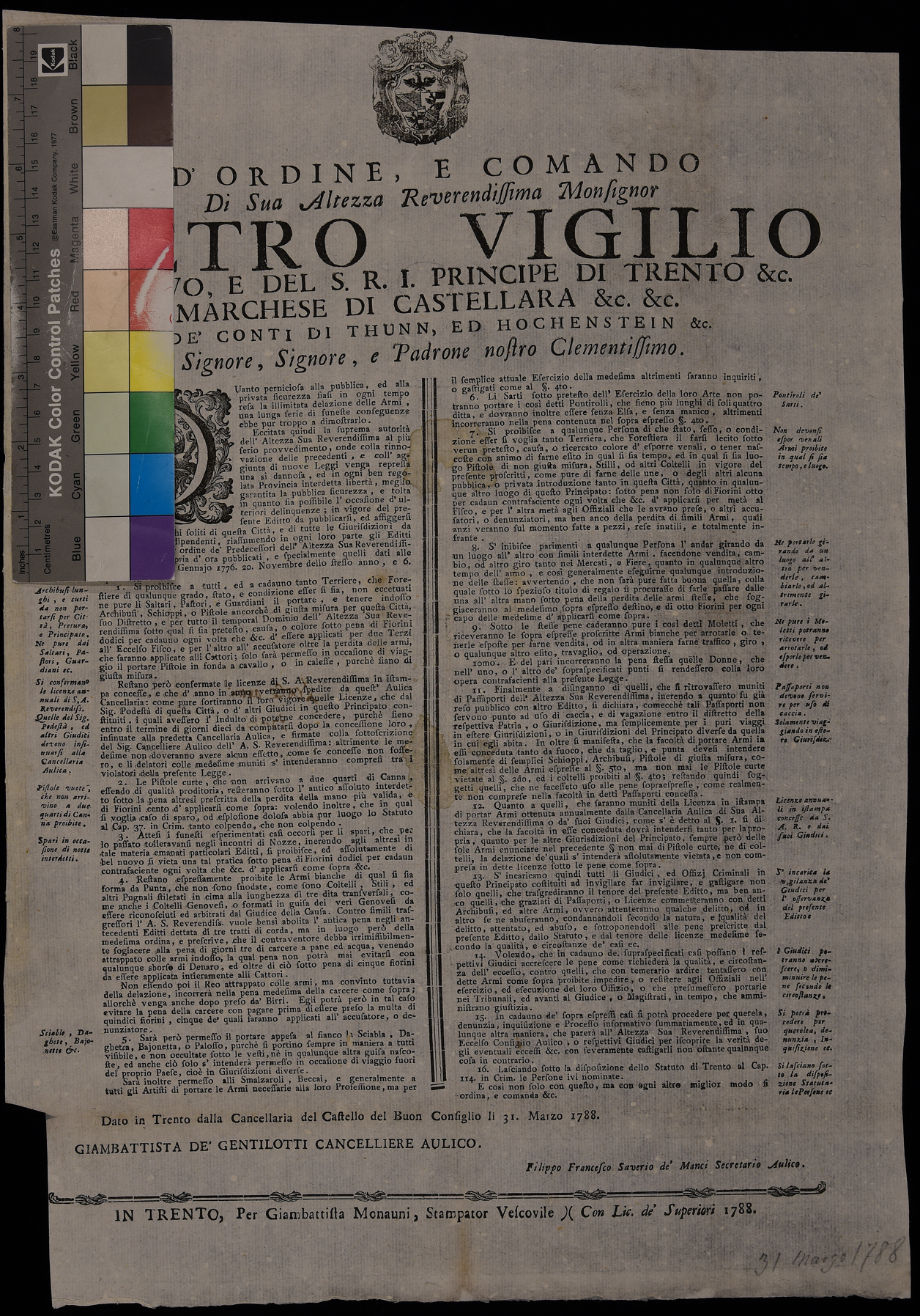 1 manifesto. Proclama sulle armi emanato il 31 marzo 1788 da Pietro Vigilio Thun principe-vescovo di Trento, stemma di Pietro Vigilio Thun