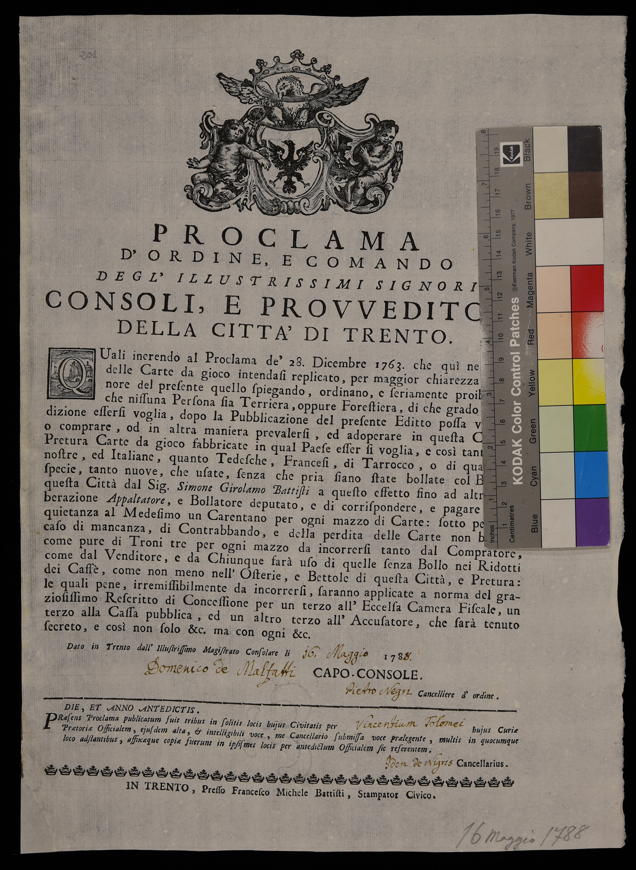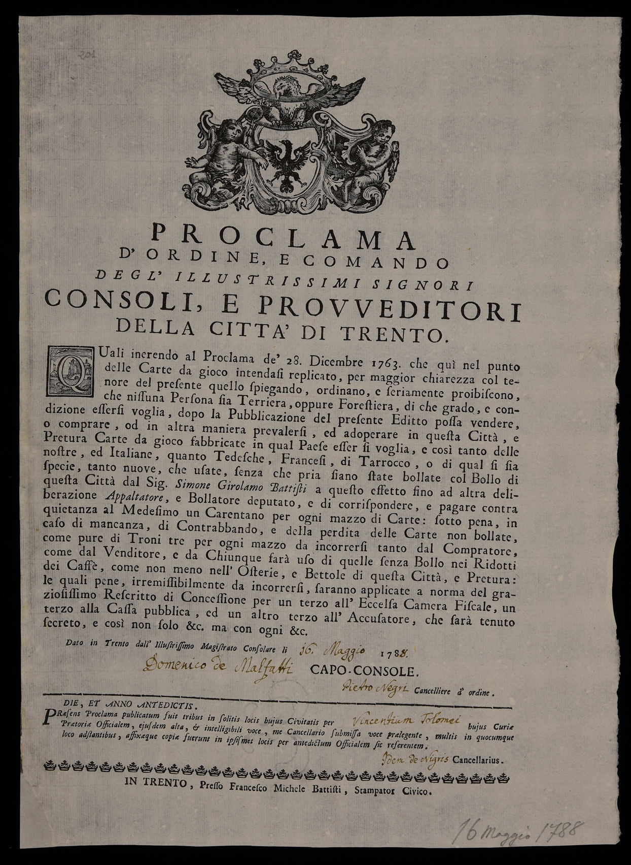 1 manifesto. Proclama sul bollo delle carte da gioco emanato il 16 maggio 1788 dal Magistrato consolare di Trento, data di emanazione da una nota manoscritta sull'esemplare della Biblioteca comunale di Trento, stemma del Magistrato consolare di Trento, stampa in realtà da attribuire a Simone Girolamo Battisti in quanto posteriore alla morte di Francesco Michele avvenuta nel 1778