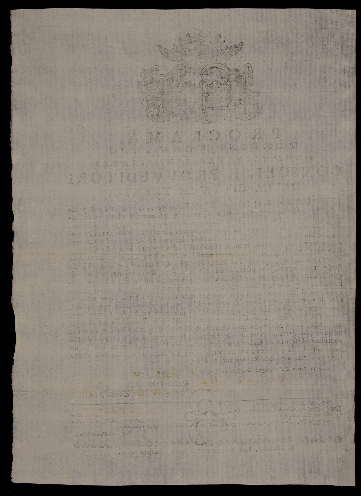 | Proclama d'ordine, e comando degl'illustrissimi signori consoli, e provveditori della città di Trento |