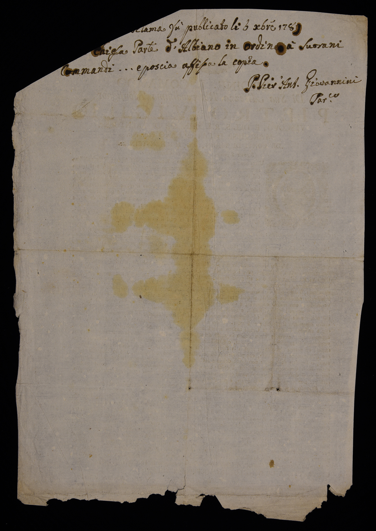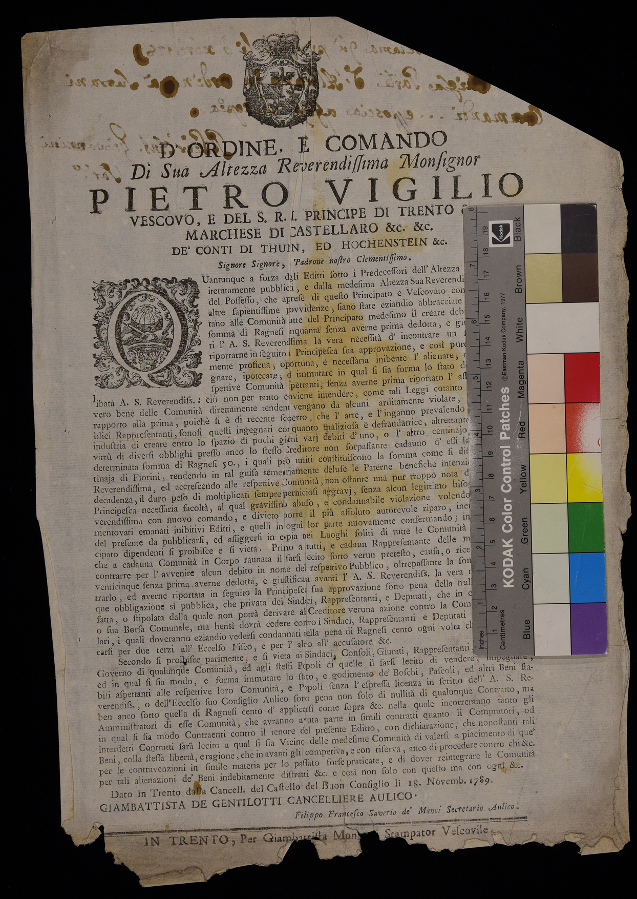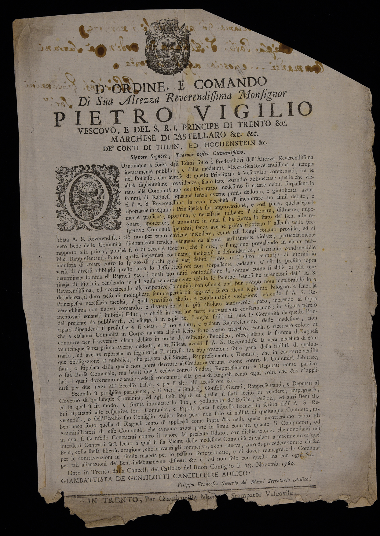 1 manifesto. Proclama sui debiti emanato il 18 novembre 1789 da Pietro Vigilio Thun, stemma di Pietro Vigilio Thun