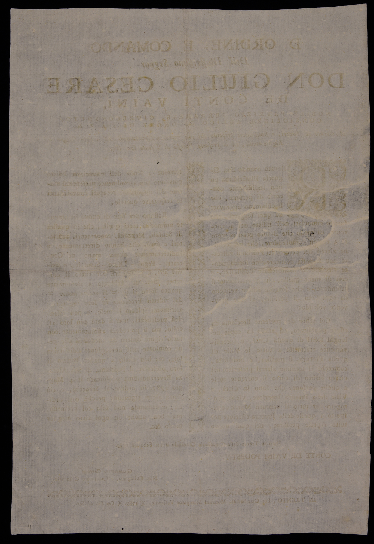 | D'ordine, e comando dell'illustrissimo signor don Giulio Cesare de' conti Vaini, nobile patrizio ferrarese, giureconsulto, consigliere aulico di onore di s.a.r. &c., avvocato de' poveri, e sindicatore perpetuo dei pro tempore governatori dell'insigne terra di Bagnacavallo, ed al presente podestà di Trento &c. &c. |