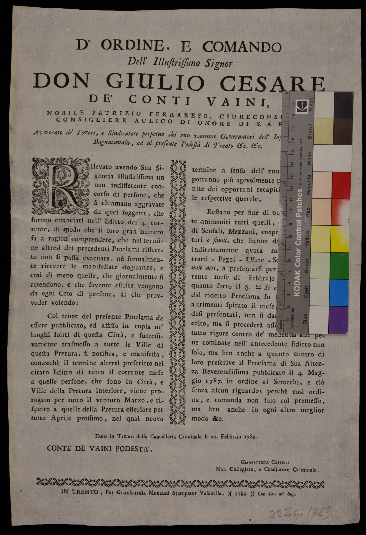 1 manifesto. Proclama sui debiti emanato il 22 febbraio 1789 da Giulio Cesare Vaini, podestà di Trento