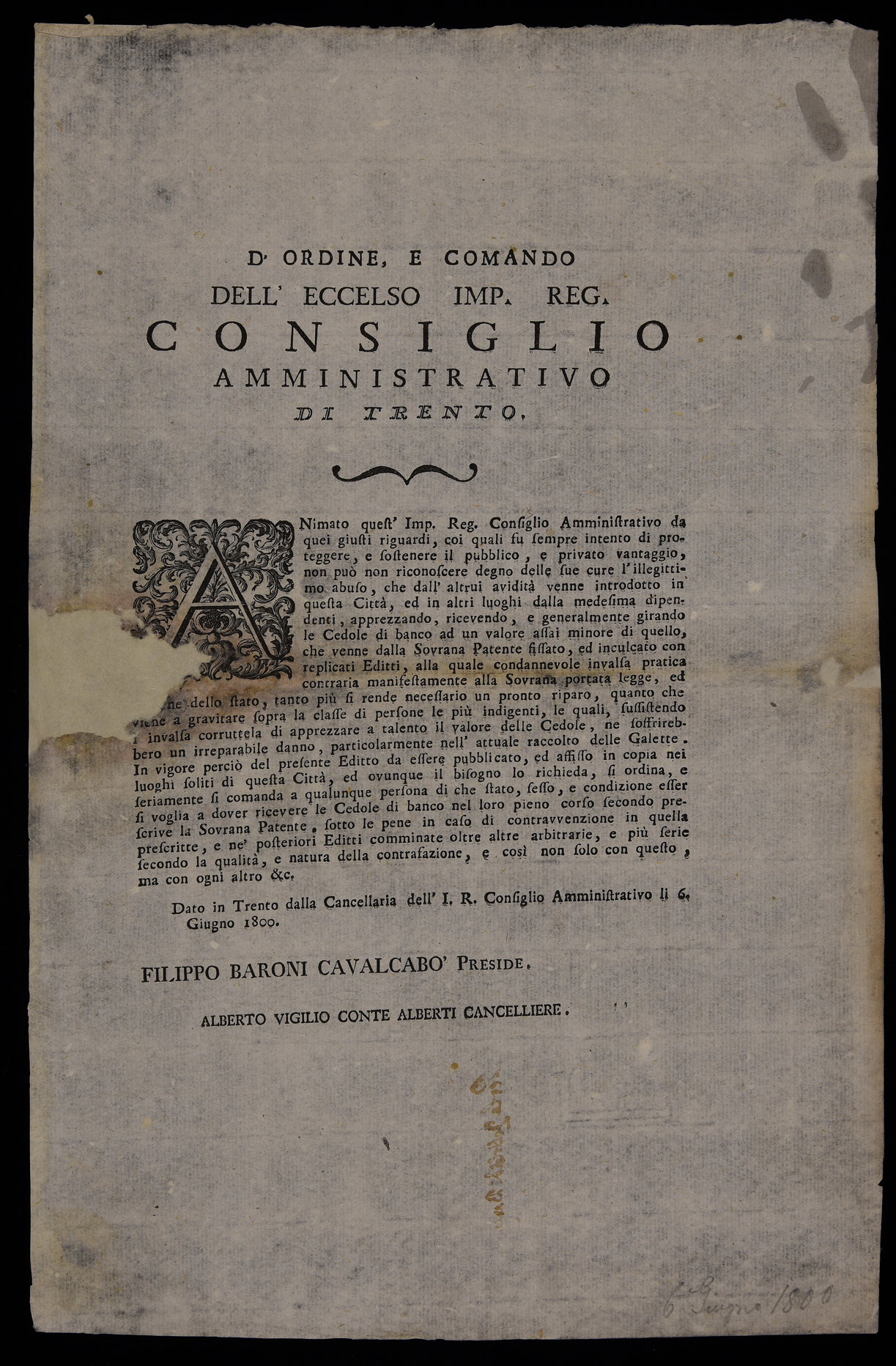 1 manifesto. Proclama contro coloro che ricevono le cedole ad un valore minore di quello stabilito per legge emanato il 6 giugno 1800 dall'Imperial regio consiglio amministrativo di Trento, sottoscritto da Filippo Cavalcabò e Alberto Vigilio Alberti, stampa attribuibile alla tipografia Monauni di Trento in base al raffronto di caratteri e fregi