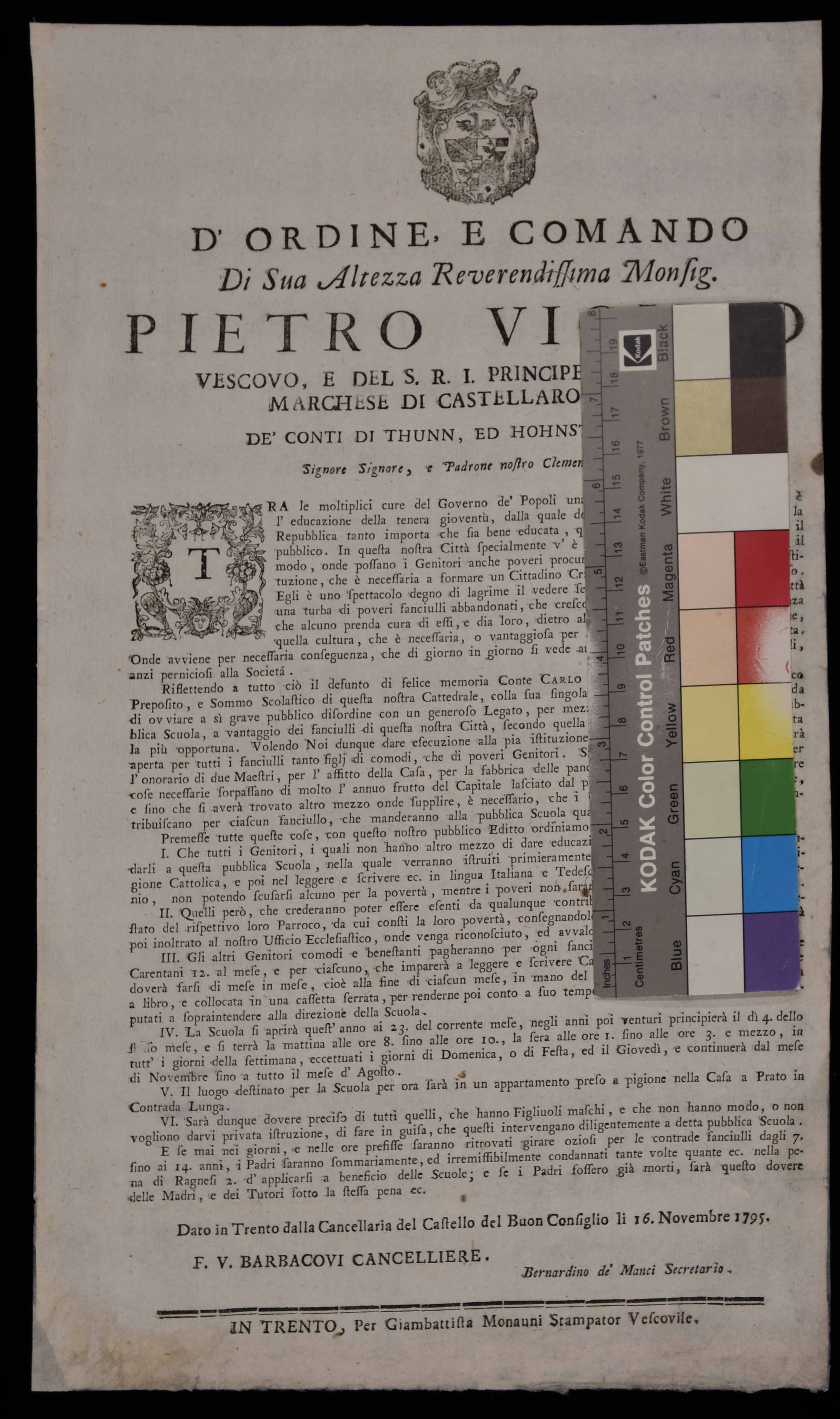 1 manifesto. Proclama sull'istituzione di una scuola pubblica emanato il 16 novembre 1795 da Pietro Vigilio Thun principe-vescovo di Trento, stemma di Pietro Vigilio Thun, sottoscritto da Francesco Vigilio Barbacovi e Bernardino Manci.