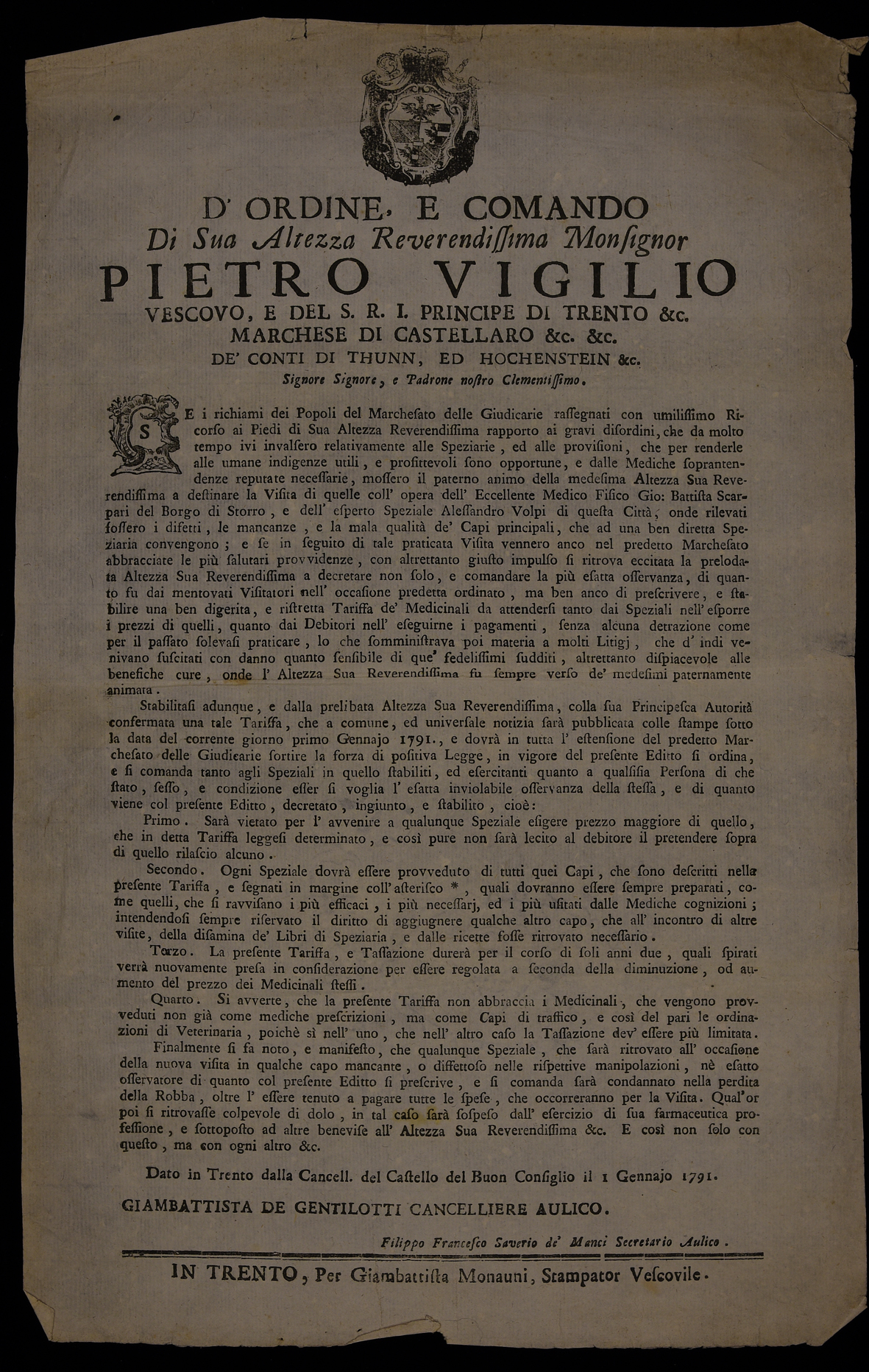 1 manifesto. Proclama sui prezzi dei medicinali da osservarsi nelle Giudicarie emanato il 1 gennaio 1791 da Pietro Vigilio Thun, principe-vescovo di Trento, stemma di Pietro Vigilio Thun