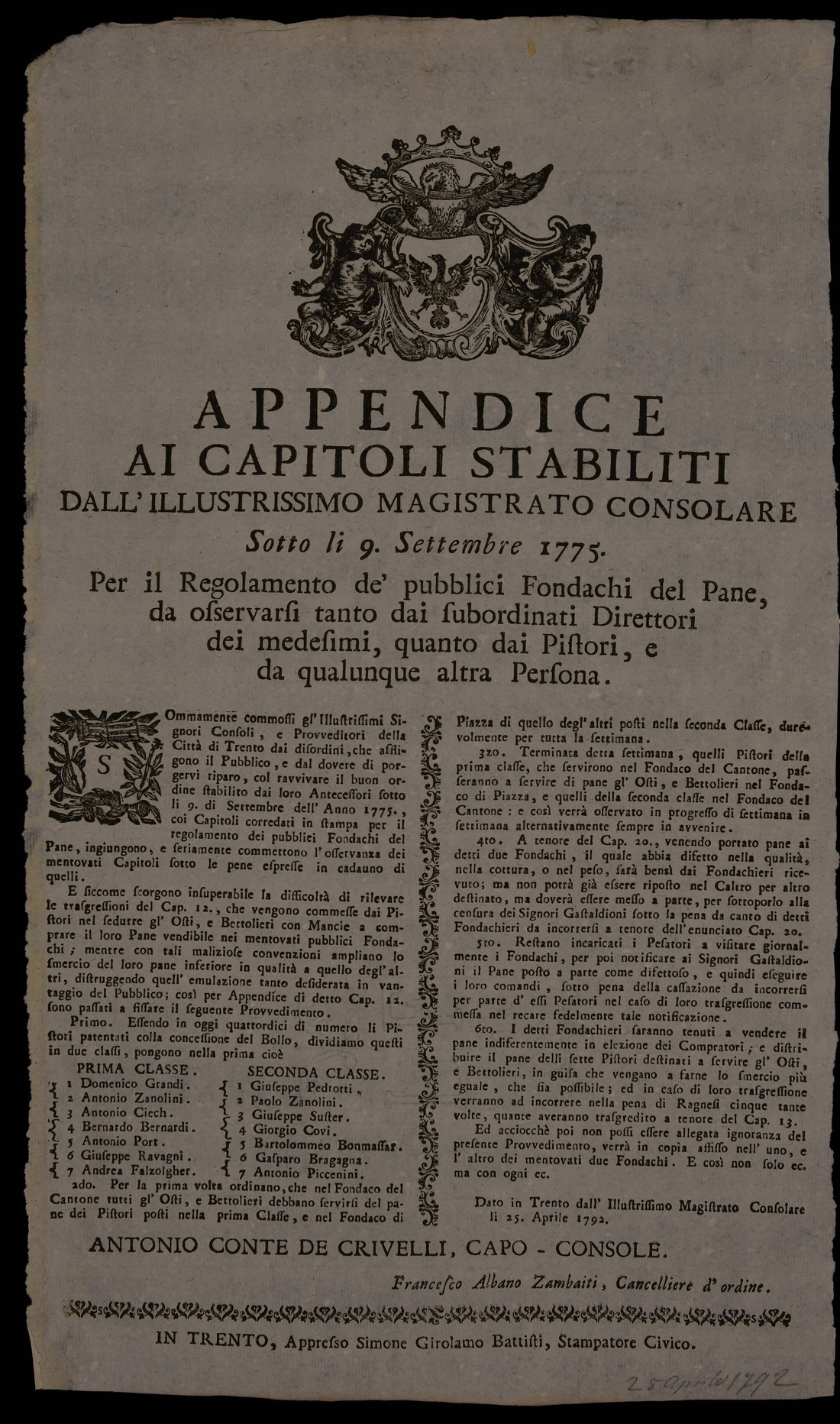 1 manifesto. Proclama sulla gestione dei magazzini del pane emanato il 25 aprile 1792 dal Magistrato consolare di Trento, stemma del Magistrato consolare di Trento
