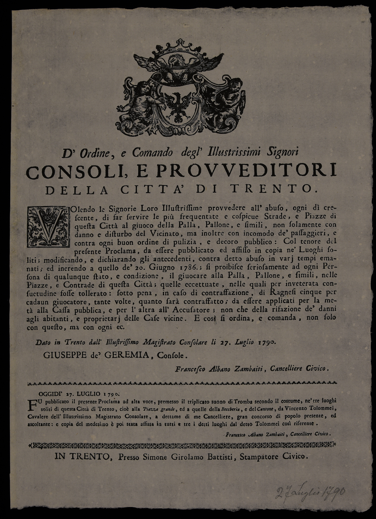 1 manifesto. Proclama che vieta il gioco della palla e simili nelle strade e piazze della città emanato il 27 luglio 1790 dal Magistrato consolare di Trento, stemma del Magistrato consolare di Trento