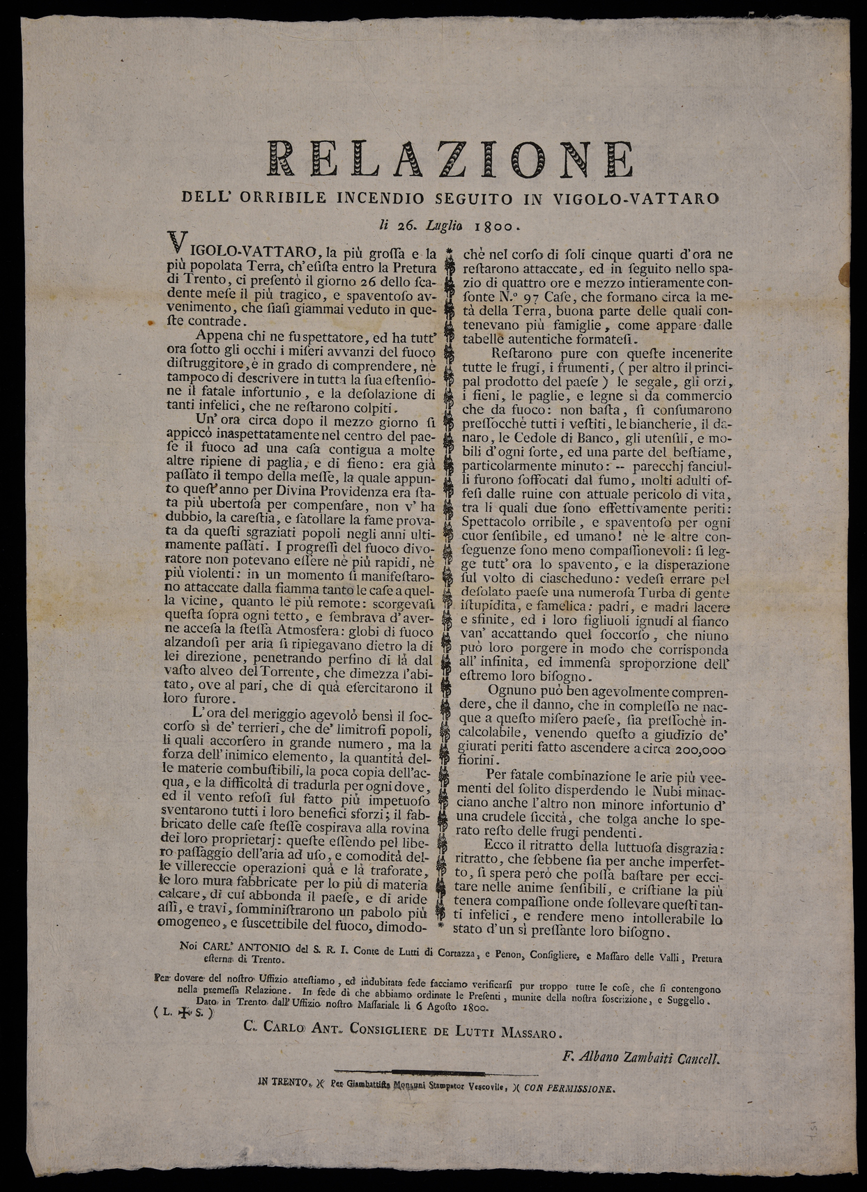 Relazione dell'orribile incendio seguito in Vigolo-Vattaro li 26. luglio 1800