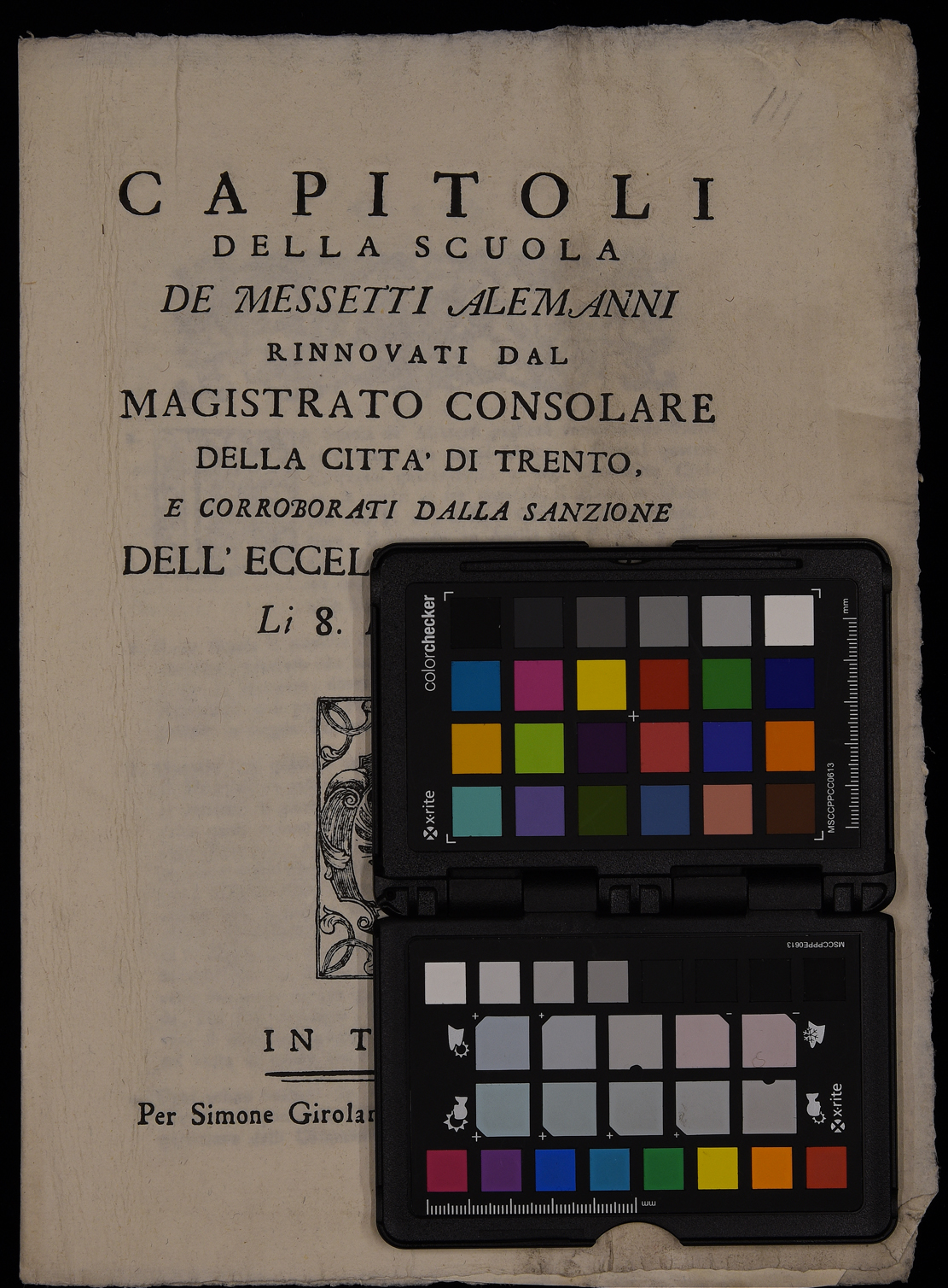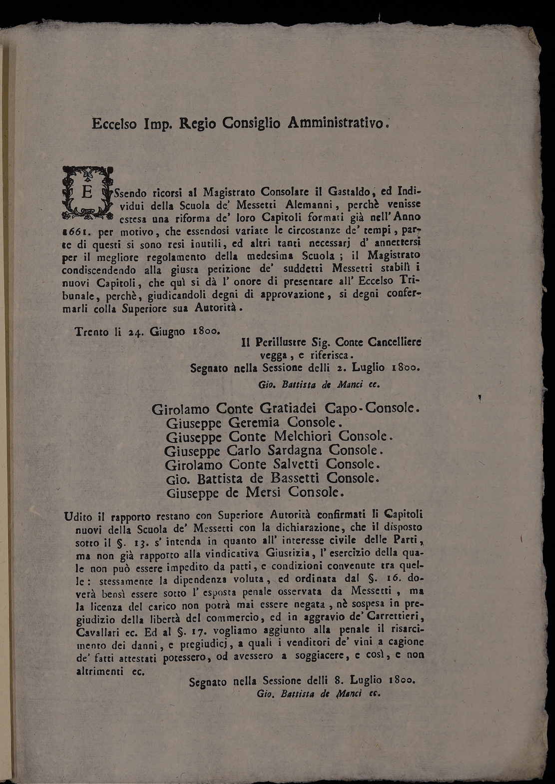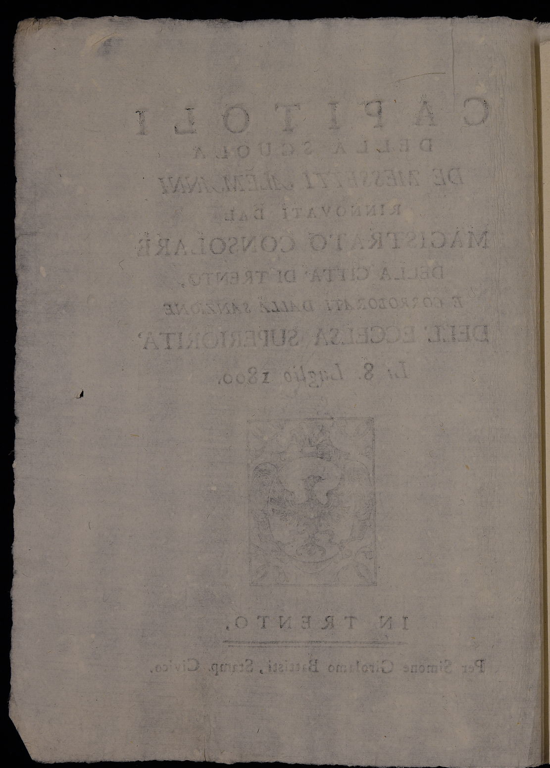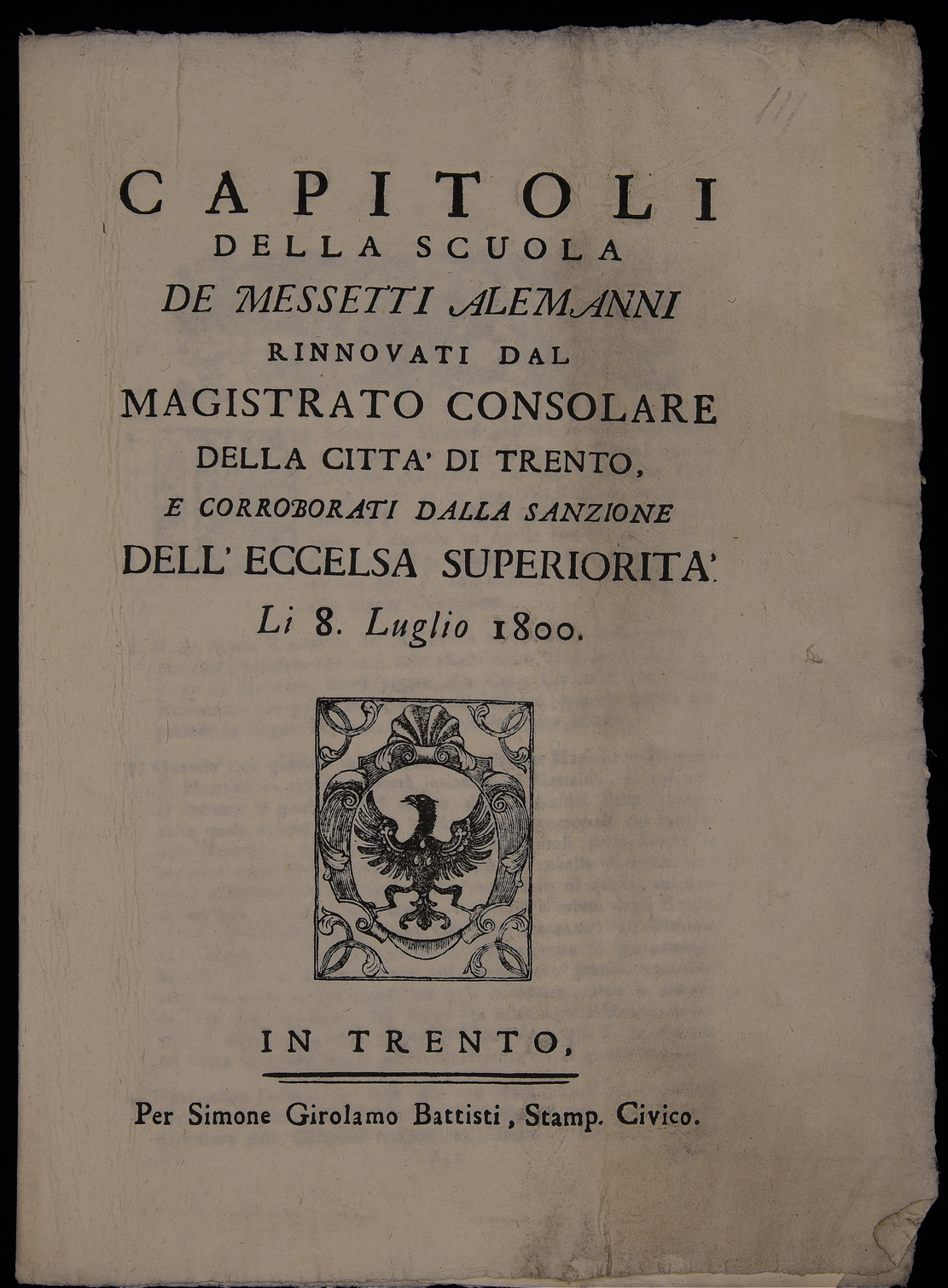 | Capitoli della scuola de messetti alemanni rinnovati dal Magistrato consolare della città di Trento, e corroborati dalla sanzione dell'Eccelsa Superiorità li 8. luglio 1800 |