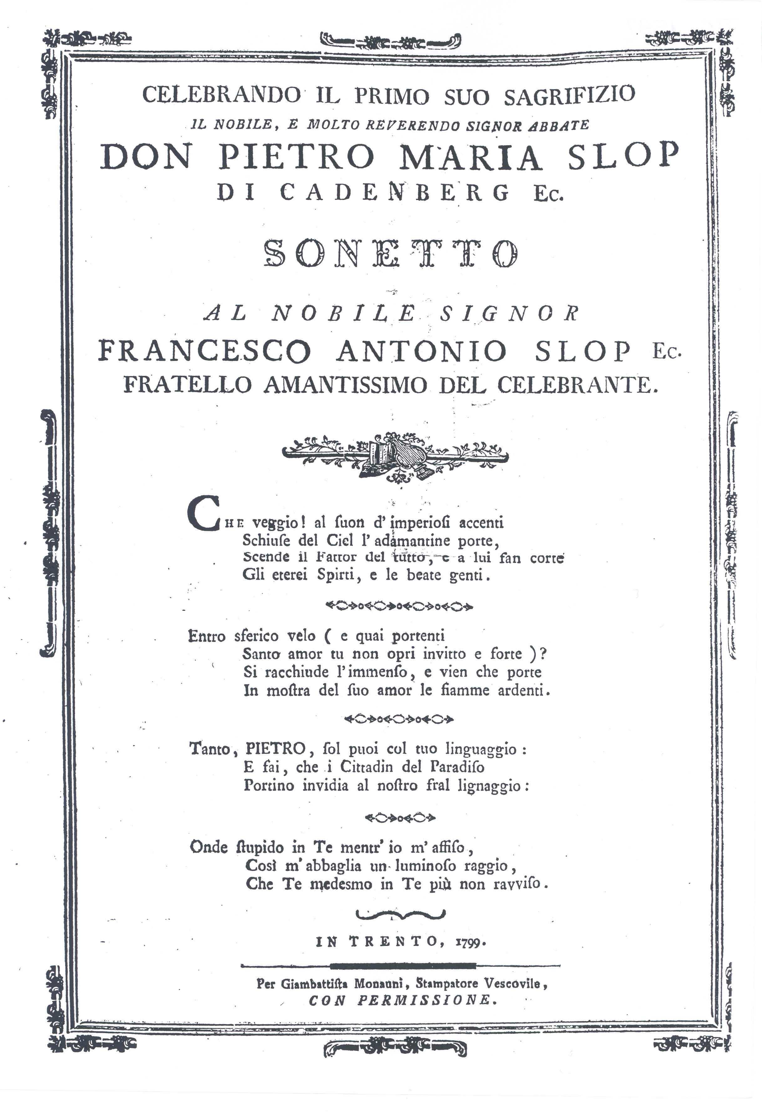 | Celebrando il primo suo sagrifizio il nobile, e molto reverendo signor abbate don Pietro Maria Slop di Cadenberg ec. sonetto al nobile signor Francesco Antonio Slop ec. fratello amantissimo del celebrante |