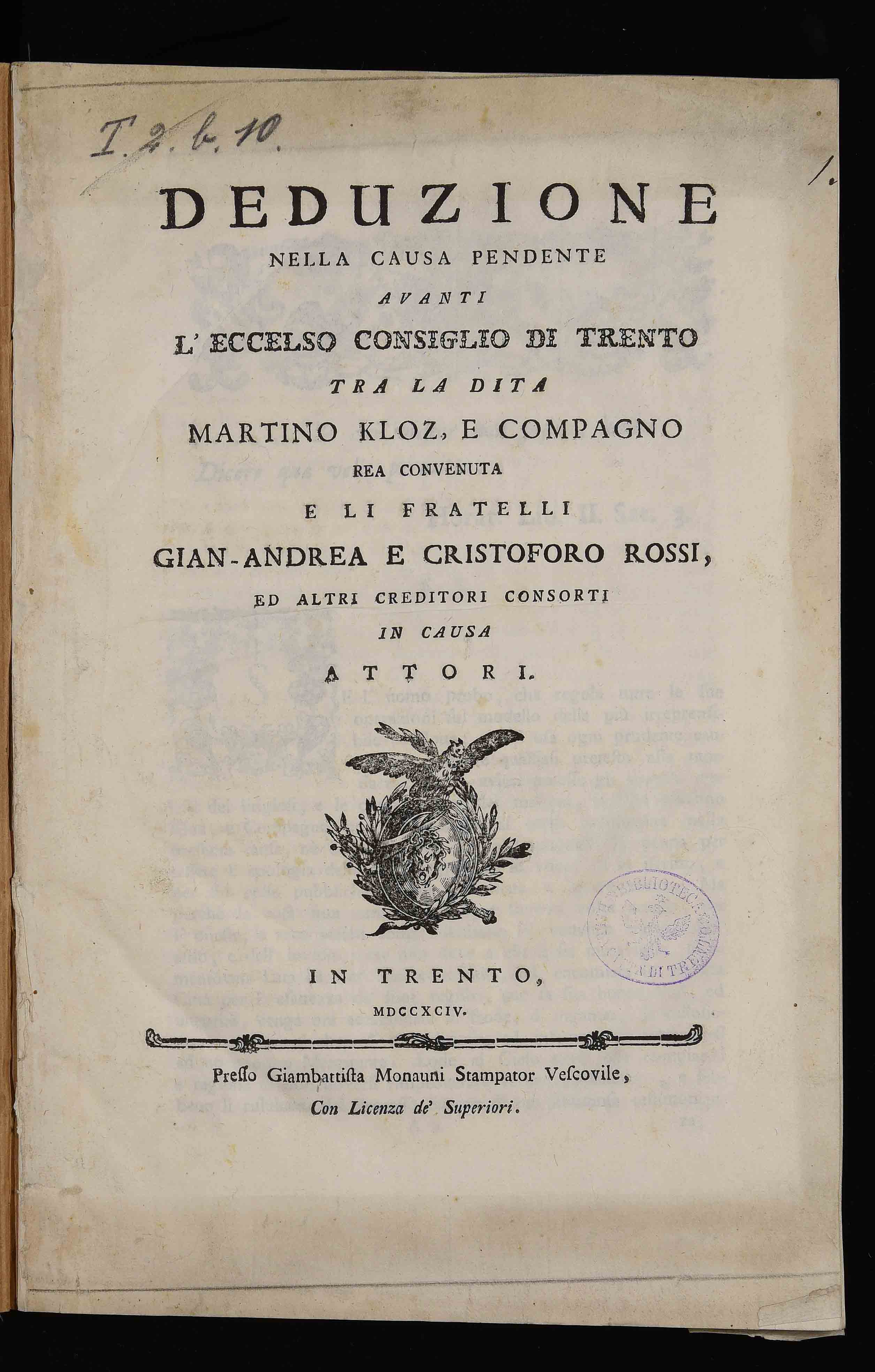 | Deduzione nella causa pendente avanti l'eccelso consiglio di Trento tra la Dita Martino Kloz, e Compagno rea convenuta e li fratelli Gian-Andrea e Cristoforo Rossi ed altri creditori consorti in causa attori |
