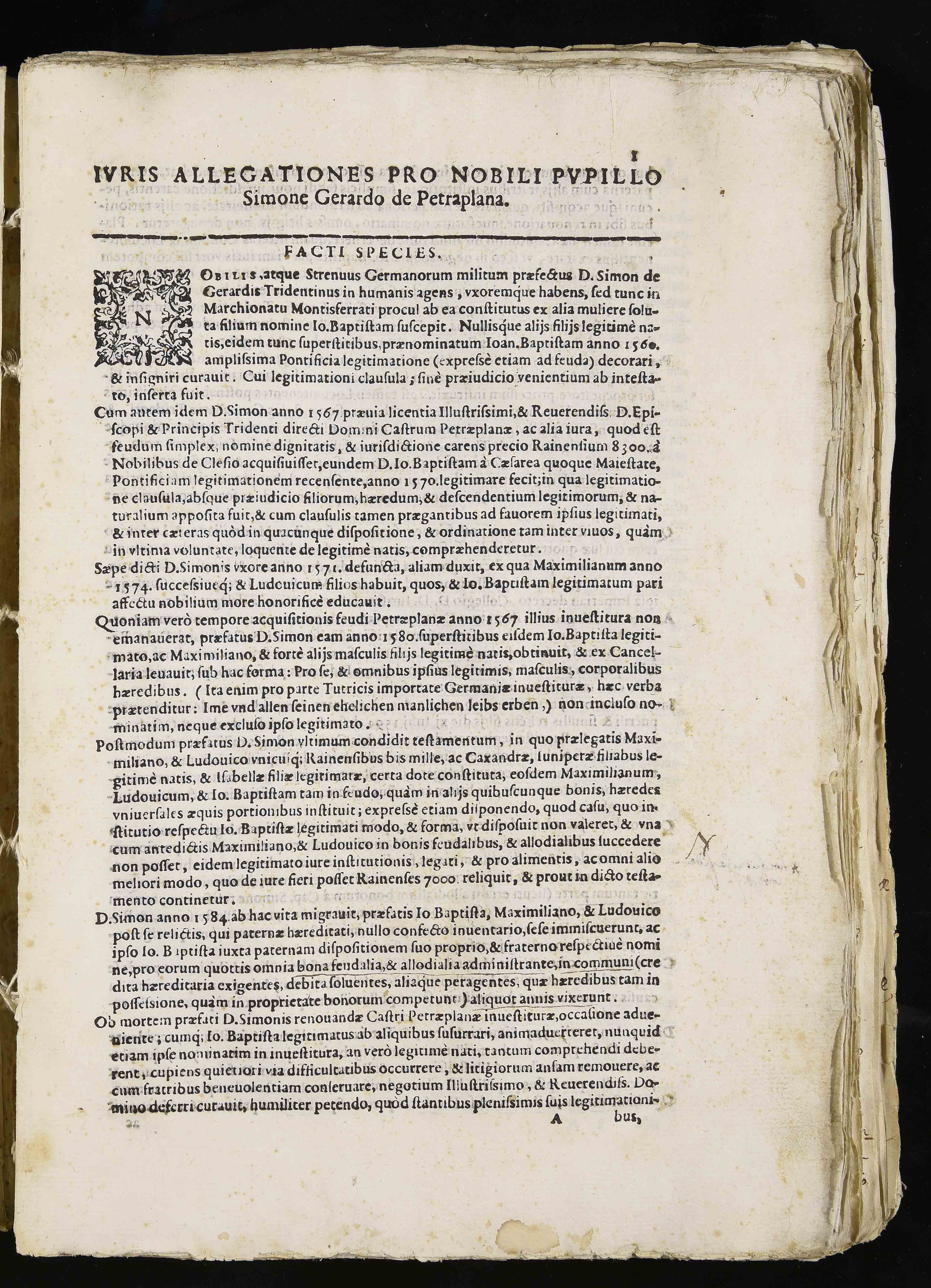 26 cc.; fol.: A-E4 F6 [$2 segnate (+ F3)]. A c. F6v, imprimatur concesso dal canonico Giuseppe Rovereti; segue marca tipografica di Gelmini e licenza dei superiori. Rilegato all'interno di un fascicolo contenenti diversi documenti manoscritti cinque-seicenteschi (principalmente copie) "In causa feudali Castri Petraplanae, ab fundos ipsi adiacentes, et propinquos. Anno 1693 a me [...] Vigilio Ruffino compilata".