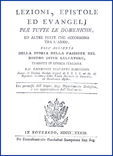 | Lezioni, epistole ed evangelj per tutte le domeniche, ed altre feste che occorrono tra l'anno, coll'aggiunta della storia della passione del nostro divin salvatore, tradotti in lingua italiana dal sacerdote Giovanni Marchetti licenc. di theolog. consigl. cappel. di s.s.i.r. ed ap. m. sopraint. direttore della scuola normale di Roveredo, ed Accademico Agiato |