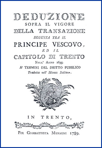 | Deduzione sopra il vigore della transazione seguita tra il principe vescovo, ed il Capitolo di Trento nell'anno 1635. a' termini del dritto pubblico tradotta nell'idioma italiano |