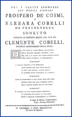| Per i felici sponsali dei nobili signori Prospero de' Cosmi, e Barbara Cobelli de Freüdenberg sonetto |