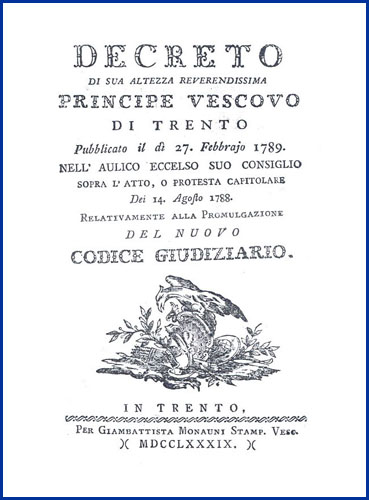 | Decreto di sua altezza reverendissima principe vescovo di Trento pubblicato il dì 27. febbrajo 1789. nell'aulico eccelso suo Consiglio sopra l'atto, o protesta capitolare dei 14. agosto 1788. relativamente alla promulgazione del nuovo codice giudiziario |