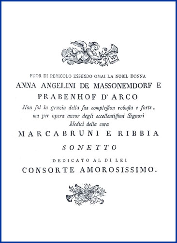 | Fuor di pericolo essendo omai la nobil donna Anna Angelini de Massonemdorf e Prabenhof d'Arco non sol in grazia della sua complession robusta e forte, ma per opera ancor degli eccellentissimi signori medici della cura Marcabruni e Ribbia sonetto |