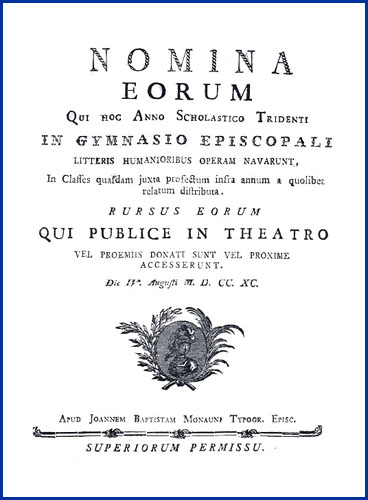| Nomina eorum qui hoc anno scholastico Tridenti in gymnasio episcopali litteris humanioribus operam navarunt, in classes quasdam juxta profectum infra annum a quolibet relatum distributa. Rursus eorum qui publice in theatro vel proemiis donati sunt vel proxime accesserunt die IV. augusti M.D.CC.XC. |