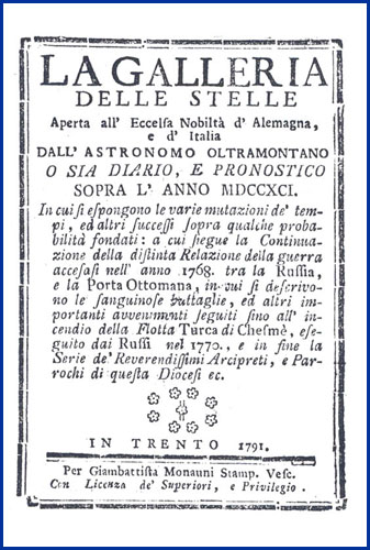 | La galleria delle stelle aperta all'eccelsa nobiltà d'Alemagna, e d'Italia dall'astronomo oltramontano, o sia diario, e pronostico sopra l'anno MDCCXCI. in cui si espongono le varie mutazioni de' tempi, ed altri successi sopra qualche probabilità fondati: a cui siegue la continuazione della distinta relazione della guerra accesasi nell'anno 1768. tra la Russia, e la Porta ottomana, in cui si descrivono le sanguinose battaglie, ed altri importanti avvenimenti seguiti sino all'incendio della flotta turca di Chesmè, eseguito dai russi nel 1770., e in fine la serie de' reverendissimi arcipreti, e parrochi di questa diocesi ec. |