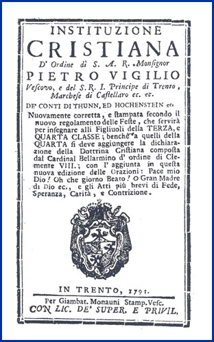 | Instituzione cristiana d'ordine di s.a.r. monsignor Pietro Vigilio vescovo, e del S.R.I. principe di Trento, marchese di Castellaro ec. ec. de' conti di Thunn, ed Hochenstein ec. nuovamente corretta, e stampata secondo il nuovo regolamento delle feste, che servirà per insegnare alli figliuoli della terza, e quarta classe; benchè a quelli della quarta si deve aggiungere la dichiarazione della dottrina cristiana composta dal cardinal Bellarmino d'ordine di Clemente VIII. ... |
