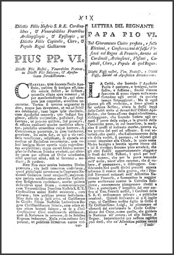 | Dilectis filiis nostris S.R.E. cardinalibus, & venerabilibus fratribus archiepiscopis, & episcopis, ac dilectis filiis capitulis, clero, & populo regni Galliarum Pius pp. VI. dilecti filii nostri, venerabiles fratres, ac dilecti filii salutem, & apostolicam benedictionem |