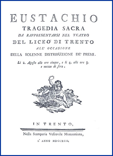 | Eustachio tragedia sacra da rappresentarsi nel teatro del liceo di Trento all'occasione della solenne distribuzione de' premi li 2. agosto alle ore cinque, e li 4. alle ore 3. e mezzo di sera |
