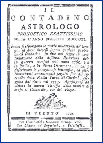 | Il contadino astrologo pronostico esattissimo sopra l'anno bisestile MDCCXCII. in cui si espongono le varie mutazioni de' tempi, ed altri successi sopra qualche probabilità fondati: in fine poi segue la continuazione della distinta relazione della guerra accesasi nell'anno 1768. tra la Russia, e la Porta ottomana, in cui si descrivono le sanguinose battaglie, ed altri importanti avvenimenti seguiti sino all'incendio della flotta turca di Chesmè, eseguito dai russi nel 1770. Aggiugnesi da ultimo la nuova tariffa delle monete al corso sì camerale, che del paese |