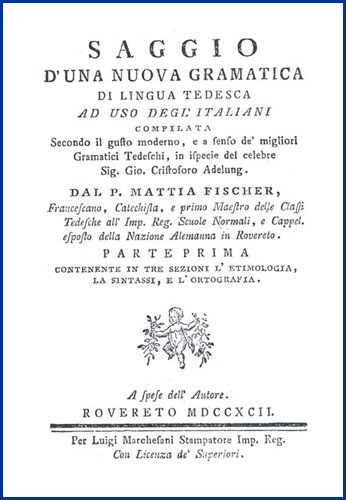 | Saggio d'una nuova gramatica di lingua tedesca ad uso degl'italiani compilata secondo il gusto moderno, e a senso de' migliori gramatici tedeschi, in ispecie del celebre sig. Gio. Cristoforo Adelung. Dal p. Mattia Fischer, francescano, catechista, e primo maestro delle classi tedesche all'imp. reg. scuole normali, e cappel. esposto della nazione alemanna in Rovereto. Parte prima contenente in tre sezioni l'etimologia, la sintassi, e l'ortografia |