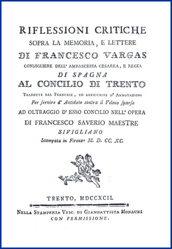 | Riflessioni critiche sopra la memoria, e lettere di Francesco Vargas consigliere dell'ambasceria cesarea, e regia di Spagna al Concilio di Trento tradotte dal francese, ed arricchite d'annotazioni per servire d'antidoto contra il veleno sparso ad oltraggio d' esso Concilio nell'opera di Francesco Saverio Maestre sivigliano stampata in Firenze M.D.CC.XC. |
