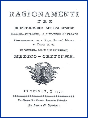 | Ragionamenti tre di Bartolommeo Gerloni seniore medico-chirurgo, e cittadino di Trento corrispondente della regia società medica di Parigi ec. ec. in conferma delle sue riflessioni medico-critiche |