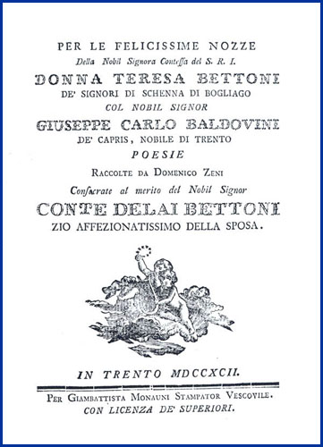 | Per le felicissime nozze della nobil signora contessa del S.R.I. donna Teresa Bettoni de' signori di Schenna di Bogliago col nobil signor Giuseppe Carlo Baldovini de' Capris, nobile di Trento. Poesie |