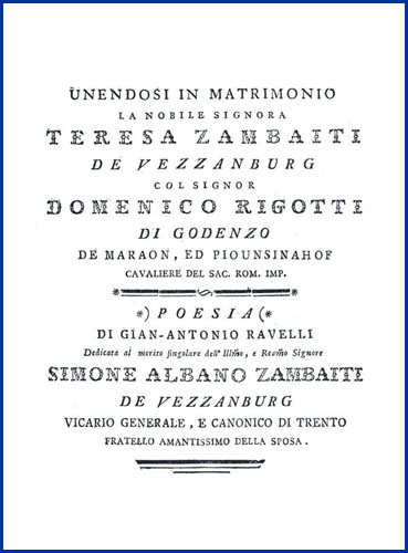 | Unendosi in matrimonio la nobile signora Teresa Zambaiti de Vezzanburg col signor Domenico Rigotti di Godenzo de Maraon, ed Piounsinahof cavaliere del Sac. Rom. Imp. poesia |