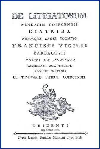 | De litigatorum mendaciis coercendis diatriba novaeque legis rogatio Francisci Vigilii Barbacovii Rheti ex Annania cancellarii aul. Trident. accedit diatriba De temerariis litibus coercendis |