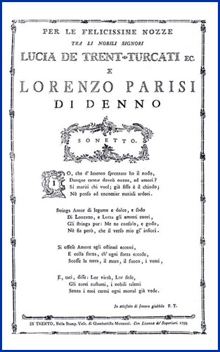 | Per le felicissime nozze tra li nobili signori Lucia de Trent-Turcati ec. e Lorenzo Parisi di Denno sonetto |