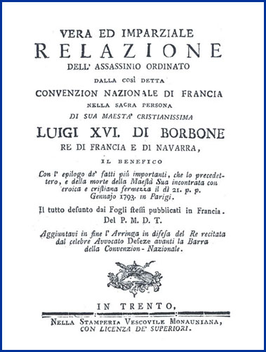 | Vera ed imparziale relazione dell'assassinio ordinato dalla così detta Convenzion nazionale di Francia nella sacra persona di sua maestà cristianissima Luigi XVI. di Borbone re di Francia e di Navarra, il Benefico con l'epilogo de' fatti più importanti, che lo precedettero, e della morte della maestà sua incontrata con eroica e cristiana fermezza il dì 21. p.p. gennajo 1793. in Parigi. Il tutto desunto dai fogli stessi pubblicati in Francia. Del P.M.D.T. Aggiuntavi in fine l'arringa in difesa del re recitata dal celebre avvocato Deseze avanti la barra della Convenzion-nazionale |