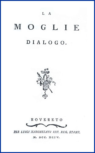 52 p. Nome dell'autore a p. 3, dialogo scritto in occasione delle nozze Altameri-Telani, dedica dell'autore a Matilda Telani. Rovereto, giugno 1794