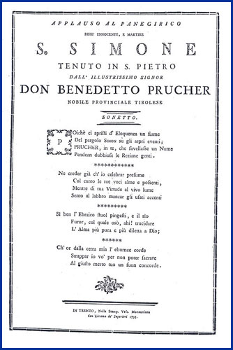 | Applauso al panegirico dell'innocente, e martire s. Simone tenuto in S. Pietro dall'illustrissimo signor don Benedetto Prucher nobile provinciale tirolese sonetto |
