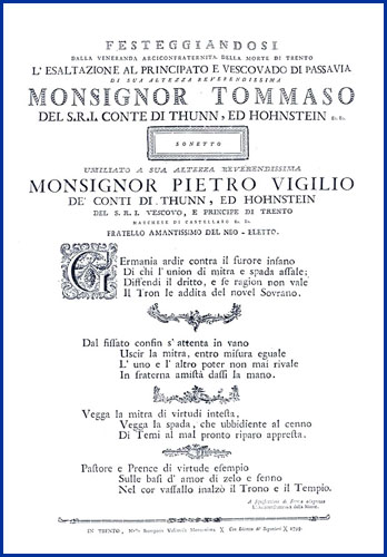 | Festeggiandosi dalla veneranda Arciconfraternita della Morte di Trento l'esaltazione al principato e vescovado di Passavia di sua altezza reverendissima monsignor Tommaso del S.R.I. conte di Thunn, ed Hohnstein ec. ec. sonetto |