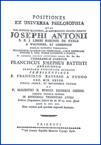 | Positiones ex universa philosophia quas sub auspiciis illustriss., ac reverendiss. domini domini Josephi Antonii S.R.I. liberi baronis de Eyrle a Waldgries, et Liebeneich nobilis patritii Tyrolensis, ecclesiarum cathedralis Tridentinae, atque imperialis insignis b. Virg. Mariae Ratisbonae canonici, et sacrorum canonum antecessoris publici &c. &c. &c. venerabilis clericus Franciscus Josephus Battisti Annaniensis seminarii episcopalis alumnus praesidentibus p. Francisco Xaverio a Fundo ord. Min. Refor. publico logicae, et metaphisicae profess. ac p. Mauritio a Burgo ejusdem ordin. publico physicae profess. in episcopali Tridentino lyceo publicae disputationi subjecit die 16. & 17. mens. junii anno M.DCC.XCV. data cuilibet post quartum arguendi facultate |