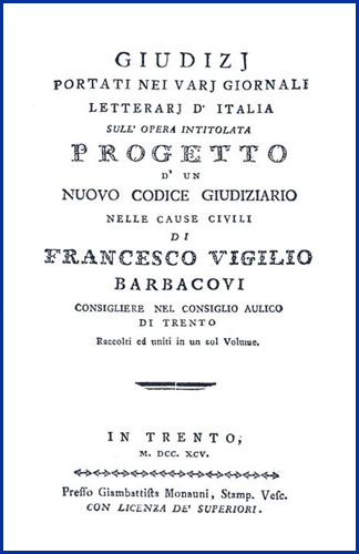 | Giudizj portati nei varj giornali letterarj d'Italia sull'opera intitolata Progetto d'un nuovo codice giudiziario nelle cause civili di Francesco Vigilio Barbacovi consigliere nel Consiglio aulico di Trento raccolti ed uniti in un sol volume |