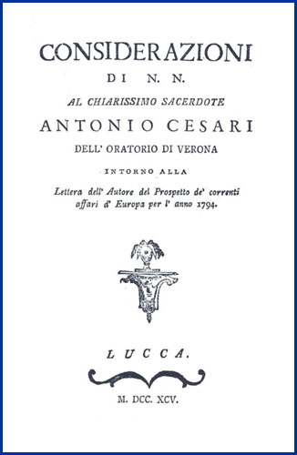 | Considerazioni di N.N. al chiarissimo sacerdote Antonio Cesari dell'oratorio di Verona intorno alla lettera dell'autore del Prospetto de' correnti affari d'Europa per l'anno 1794. |