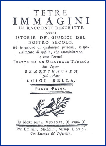 | Tetre immagini in racconti descritte ossia istorie de' giudici del nostro secolo. Ad istruzione di qualunque persona, e specialmente di quelle, che amministrano le cose forensi tratte da un originale tedesco del signor Ekartshausen dal abate Luigi Bella. Parte prima [-seconda] |