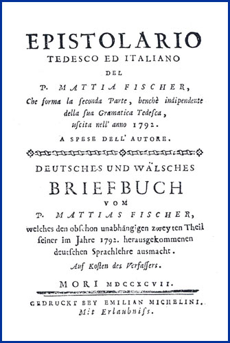 | Epistolario tedesco ed italiano del p. Mattia Fischer, che forma la seconda parte, benchè indipendente della sua gramatica tedesca, uscita nell'anno 1792. A spese dell'autore. Deutsches und wälsches Briefbuch vom P. Mattias Fischer, welches den obschon unabhängigen zweyten Theil seiner im Jahre 1792. herausgekommenen deutschen Sprachlehre ausmacht. Auf Kosten des Verfassers |