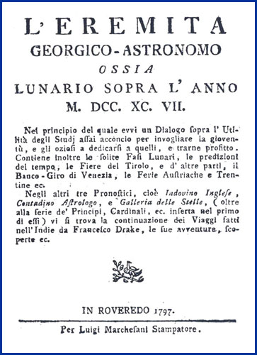 | L'eremita georgico-astronomo ossia lunario sopra l'anno M.DCC.XC.VII. nel principio del quale evvi un dialogo sopra l'unità degli studj assai acconcio per invogliare la gioventù, e gli oziosi a dedicarsi a quelli, e trarne profitto. Contiene inoltre le solite fasi lunari, le predizioni del tempo; le fiere del Tirolo, e d'altre parti, il Banco-Giro di Venezia; le ferie austriache e trentine ec. Negli altri tre pronostici, cioè Indovino inglese, Contadino astrologo, e Galleria delle stelle, (oltre alla serie de' principi, cardinali, ec. inserta nel primo di essi) vi si trova la continuazione dei viaggi fatti nell'Indie da Francesco Drake, le sue avventure, scoperte ec. |