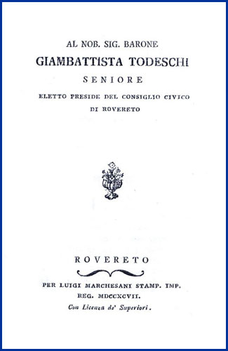 | Al nob. sig. barone Giambattista Todeschi seniore eletto preside del Consiglio civico di Rovereto |